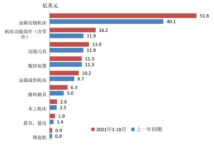 進口方面,2021年1-10月總體呈現明顯增長的態勢。機床工具商品進口115.2億美元,同比增長23.1%。其中:金屬加工機床進口額62.0億美元,同比增長27.1%(其中,金屬切削機床進口額51.8億美元,同比增長29.1%;金屬成形機床進口額10.2億美元,同比增長18.2%)。切削刀具進口額13.9億美元,同比增長16.7%。磨料磨具進口額6.3億美元,同比增長26.8%。