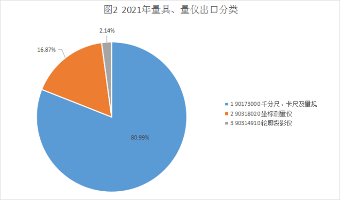 2. 2021年量具和量儀出口額(表8)14.44億人民幣,同比2020年增長30.19%,與2019年同比增長14.85%。其中,量具(千分尺、卡尺及量規)出口額11.69億人民幣,同比2020年增長30.83%;量儀(坐標測量儀、輪廓投影儀)出口額2.74億人民幣,同比2020年增長27.51%。