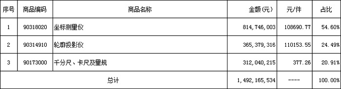 2021年量具和量儀進口額(表9)14.92億人民幣,同比2020年增長26.47%,與2019年同比增長11.73%。其中,量具進口3.12億人民幣,同比2020年增長3.89%,量儀(坐標測量儀、輪廓投影儀)進口11.8億人民幣,同比2020年增長34.18%。