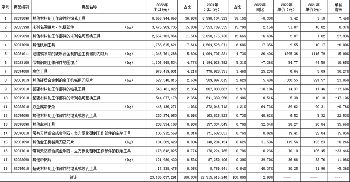 中國機床工具工業協會工具分會秘書處收集和整理了2022年工具(刀具,量具,量儀)進出口海關數據,并進行了計算和分析,供行業參考。