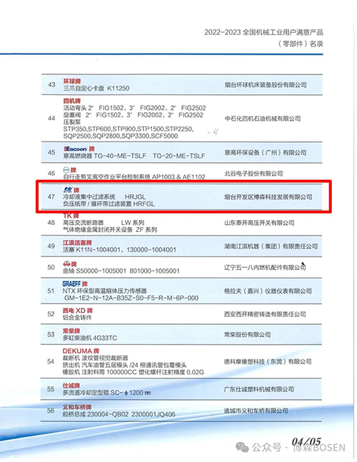 1. 煙臺博森產(chǎn)品入選“全國機械工業(yè)用戶滿意產(chǎn)品(零部件)名錄”
