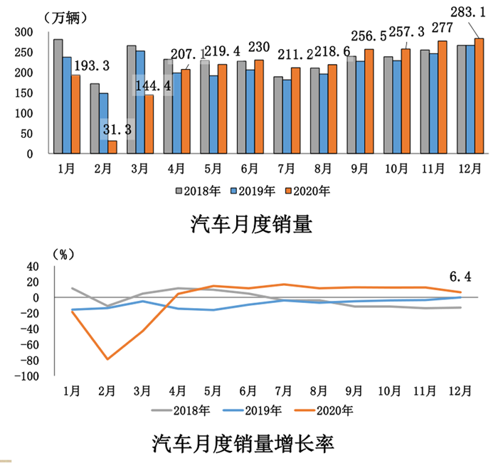 2020年12月,汽車產銷分別完成284.0萬輛和283.1萬輛,產銷量同比分別增長5.7%和6.4%。