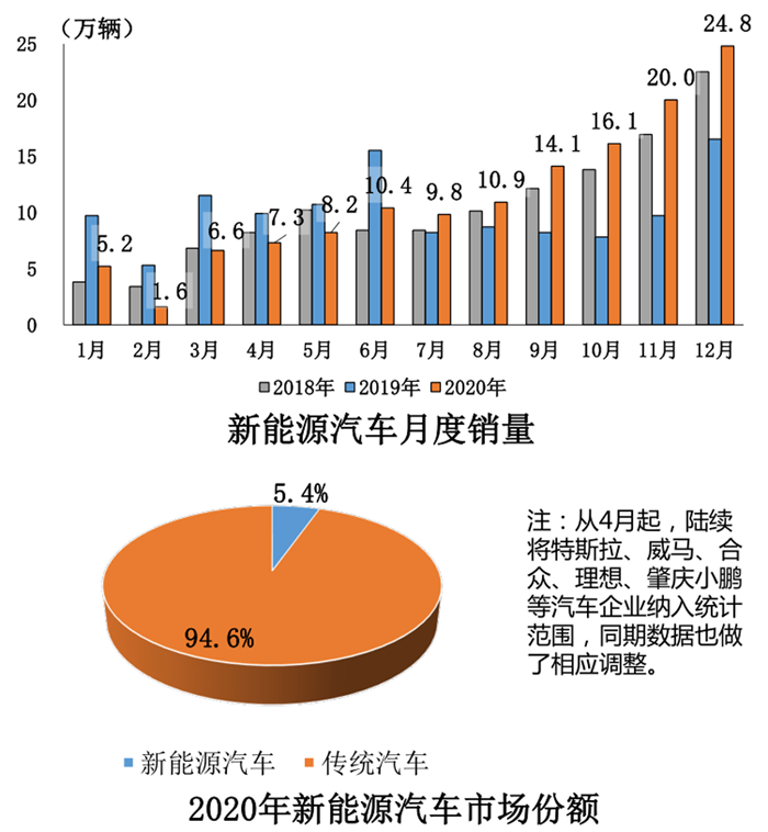從月度產銷情況來看,新能源汽車從7月份開始呈現增長態勢,增幅逐漸擴大,12月更是創下歷史新高。