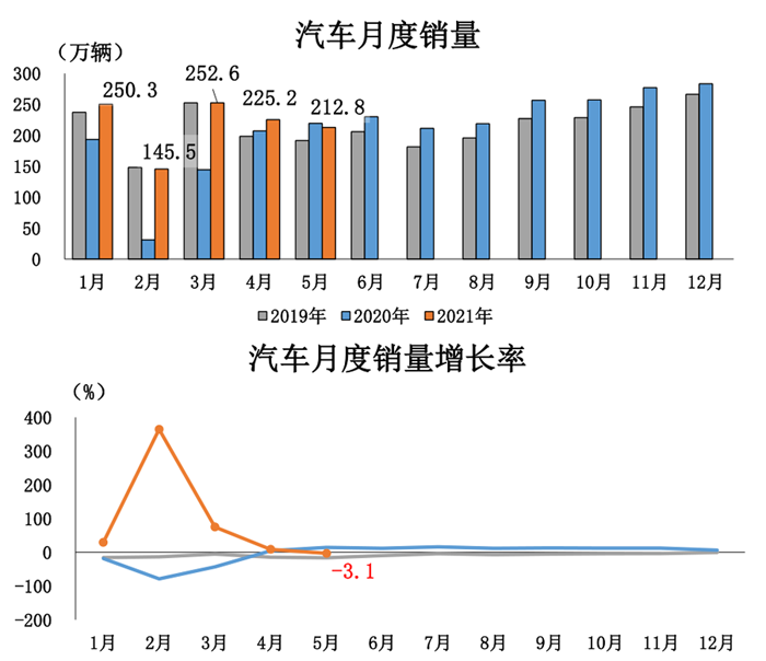 1-5月,汽車產(chǎn)銷分別完成1062.6萬輛和1087.5萬輛,同比分別增長36.4%和36.6%,增幅比1-4月繼續(xù)回落17和15.2個百分點(diǎn)。與2019年同期相比,產(chǎn)銷同比分別增長3.6%和5.8%,增幅比1-4月擴(kuò)大1.5和1.3個百分點(diǎn)。