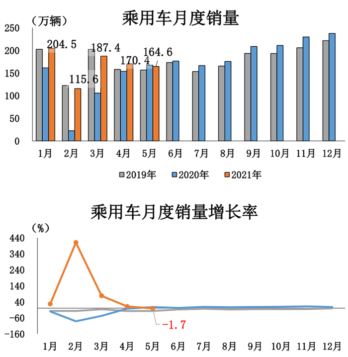 1-5月,乘用車產(chǎn)銷分別完成828.5萬輛和843.7萬輛,同比分別增長39.1%和38.1%,增幅比1-4月繼續(xù)回落16.2和15個百分點(diǎn)。與2019年同期相比,產(chǎn)量同比分別下降1.4%,銷量同比增長0.3%,其中產(chǎn)量降幅比1-4月繼續(xù)收窄2個百分點(diǎn),銷量增速已實(shí)現(xiàn)由負(fù)轉(zhuǎn)正。