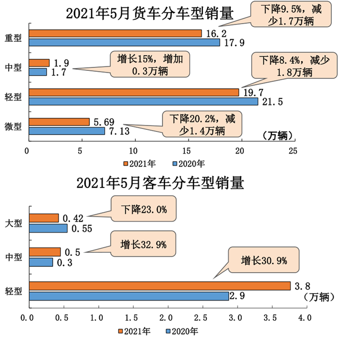 1-5月,商用車產(chǎn)銷分別完成234.1萬輛和243.8萬輛,同比分別增長27.8%和31.9%,增幅比1-4月別回落19.2和15.4個百分點(diǎn)。與2019年同期相比,商用車產(chǎn)銷同比增長26%和30.6%,其中產(chǎn)量增幅比1-4月回落1.8個百分點(diǎn),銷量增幅比1-4月擴(kuò)大1.5個百分點(diǎn)。