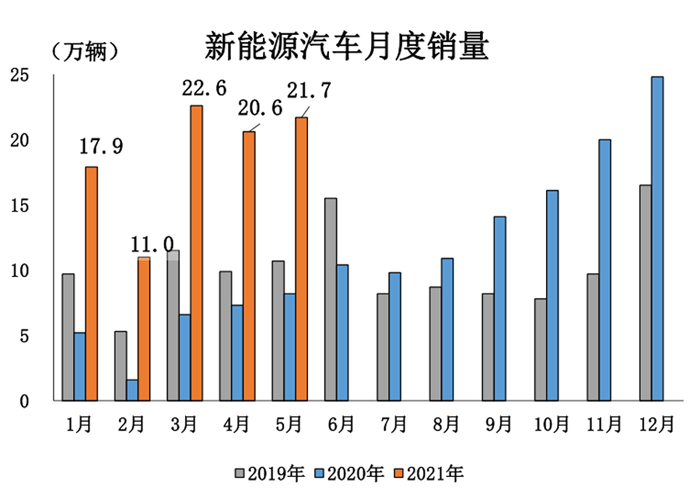 5月,新能源汽車產(chǎn)銷均完成21.7萬輛,同比分別增長1.5倍和1.6倍,繼續(xù)刷新當(dāng)月歷史記錄。其中純電動汽車產(chǎn)銷分別完成18.1萬輛和17.9萬輛,同比分別增長1.8倍和1.7倍;插電式混合動力汽車產(chǎn)銷分別完成3.6萬輛和3.9萬輛,同比分別增長67.8%和1.2倍;燃料電池汽車產(chǎn)銷分別完成38輛和9輛,同比分別下降41.5%和90.0%。