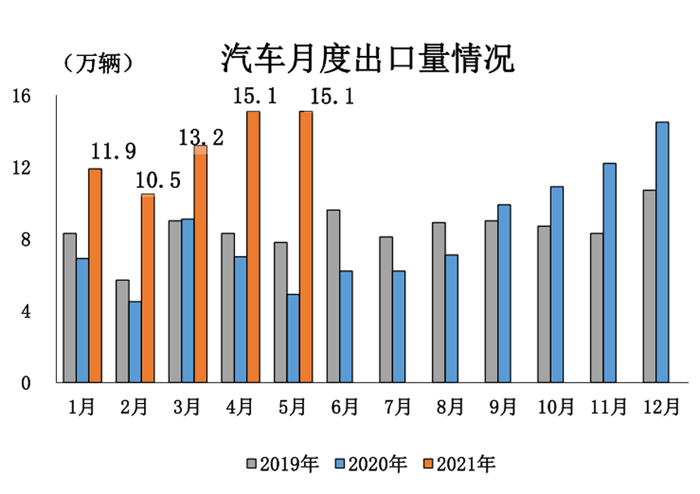 5月,汽車企業(yè)出口15.1萬輛,環(huán)比下降0.2%,同比增長2.1倍。本月出口繼續(xù)刷新當(dāng)月歷史記錄。分車型看,乘用車本月出口11.5萬輛,環(huán)比下降1.4%,同比增長2.3倍;商用車出口3.6萬輛,環(huán)比增長3.9%,同比增長1.6倍。