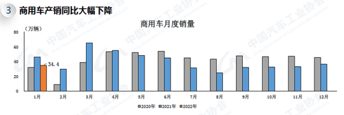 1月,商用車產銷34.5萬輛和34.4萬輛,環比下降9.3%和5.5%,同比下降28.0%和25.1%。在商用車主要品種中,與上月相比,貨車銷量略增,產量小幅下降,客車產銷均呈快速下降;與上年同期相比,貨車和客車產銷均呈下降,貨車降幅更為明顯。