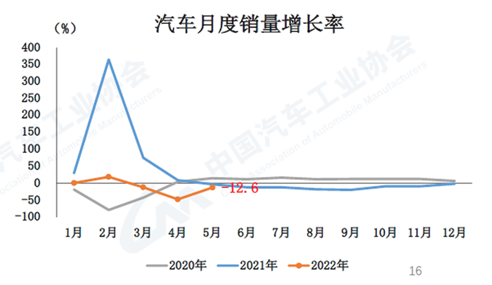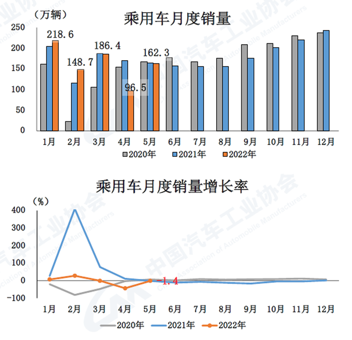 5月,汽車產(chǎn)銷分別達(dá)到192.6萬輛和186.2萬輛,環(huán)比增長59.7%和57.6%,同比下降5.7%和12.6%,降幅比4月分別收窄40.4個百分點和35.0個百分點。