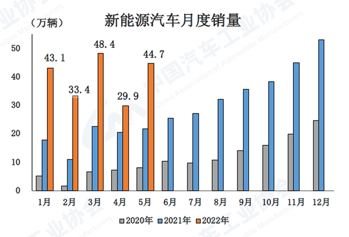 5月,新能源汽車產(chǎn)銷表現(xiàn)也較為出色,當(dāng)月產(chǎn)銷分別達(dá)到46.6萬輛和44.7萬輛,環(huán)比增長49.5%和49.6%,同比增長均為1.1倍,市場占有率達(dá)到24.0%。