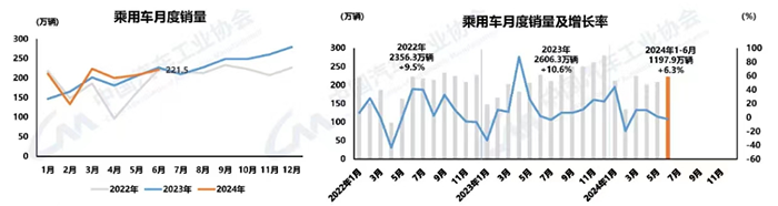 乘用車產銷環比小幅增長。6月,乘用車產銷分別完成217.7萬輛和221.5萬輛,環比分別增長6.2%和6.7%,同比分別下降1.9%和2.3%。1-6月,乘用車產銷分別完成1188.6萬輛和1197.9萬輛,同比分別增長5.4%和6.3%。
