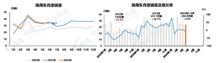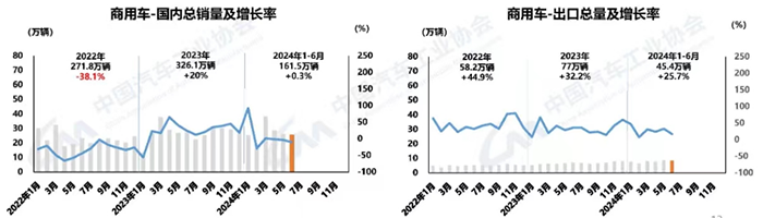6月,商用車國內銷量25.5萬輛,環比下降0.8%,同比下降10.3%;商用車出口8.2萬輛,環比下降2.5%,同比增長16.9%。1-6月,商用車國內銷量161.5萬輛,同比增長0.3%;商用車出口45.4萬輛,同比增長25.7%。