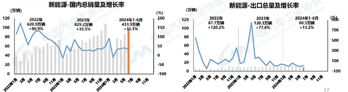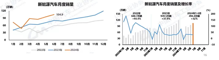 新能源汽車繼續保持較快增長。6月,新能源汽車產銷分別完成100.3萬輛 和104.9萬