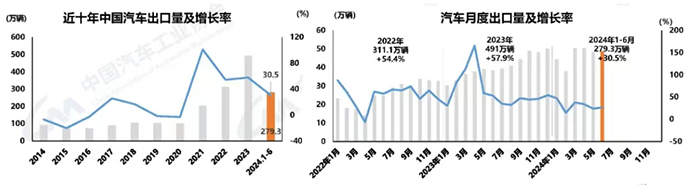 汽車出口同比快速增長。6月,汽車出口48.5萬輛,環比增長0.7%,同比增長26.9%。分車型看,乘用車出口40.3萬輛,環比增長1.4%,同比增長29.1%;商用車出口8.2萬輛,環比下降2.5%,同比增長16.9%。1-6月,汽車出口279.3萬輛,同比增長30.5%。分車型看,乘用車出口233.9萬輛,同比增長31.5%;商用車出口45.4萬輛,同比增長25.7%。