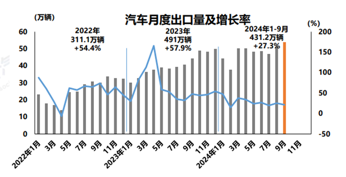 1-9月,汽車(chē)出口431.2萬(wàn)輛,同比增長(zhǎng)27.3%。分車(chē)型看,乘用車(chē)出口363.3萬(wàn)輛,同比增長(zhǎng)28%;商用車(chē)出口67.9萬(wàn)輛,同比增長(zhǎng)23.6%。