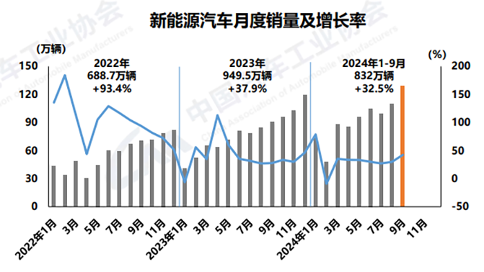 1-9月,新能源汽車(chē)產(chǎn)銷累計(jì)完成831.6萬(wàn)輛和832萬(wàn)輛,同比分別增長(zhǎng)31.7%和32.5%,新能源汽車(chē)新車(chē)銷量達(dá)到汽車(chē)新車(chē)總銷量的38.6%。在新能源汽車(chē)主要品種中,與上年同期相比,三大類新能源汽車(chē)品種產(chǎn)銷均呈不同程度增長(zhǎng)。