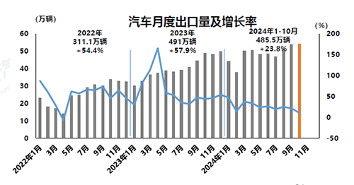 1-10月,汽車出口485.5萬輛,同比增長23.8%。分車型看,乘用車出口410萬輛,同比增長24%;商用車出口75.5萬輛,同比增長22.5%。