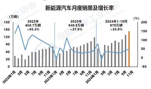10月,新能源汽車繼續保持快速增長,月度產銷再創新高。當月,新能源汽車產銷分別完成146.3萬輛和143萬輛,環比分別增長11.9%和11.1%,同比分別增長48%和49.6%,新能源汽車新車銷量達到汽車新車總銷量的46.8%。
