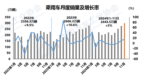 11月,乘用車產銷分別完成310.9萬輛和300.1萬輛,環比分別增長14.9%和9%,同比分別增長14.9%和15.2%,乘用車月度產銷首次突破300萬輛。在乘用車主要品種中,與上月相比,四大類乘用車品種產銷均呈不同程度增長;與上年同期相比,基本型乘用車(轎車)產銷小幅增長,其他三大類乘用車品種產銷均呈兩位數明顯增長。