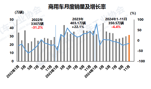 11月,商用車產銷分別完成32.7萬輛和31.5萬輛,環比分別增長12.8%和5.6%,同比分別下降15.7%和13.9%。在商用車主要品種中,與上月相比,客車和貨車產銷均呈不同程度增長;與上年同期相比,客車產銷小幅下降,貨車產銷兩位數下降。