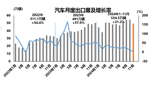 1-11月,汽車出口534.5萬輛,同比增長21.2%。分車型看,乘用車出口452萬輛,同比增長21.5%;商用車出口82.6萬輛,同比增長19.3%。