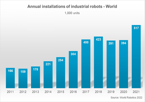 國際機器人聯合會IFR近期發布數據顯示,2021年全球新裝工業機器人達51.7萬臺,同比增長31%,創歷史新高,近五年年均增長11%。