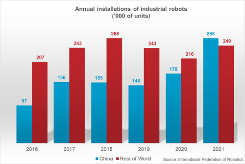 在這一數據背后,中國無疑是最大的亮點。2021年新裝機量遙遙領先于其他國家和地區,并首次在全球市場占比超過50%。體現出中國制造業向自動化發展的迅猛之勢。