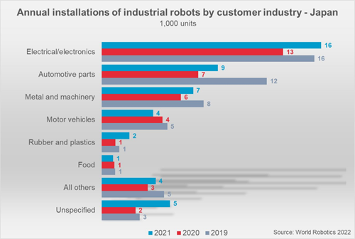 2021年,日本繼續成為全球第二大工業機器人市場,雖然2019和2020連續兩年新機裝機量下降,但2021年實現了22%的增速,達到47182臺;在用保有量為393326臺,同比增長5%。日本不僅是重要的應用市場,也是世界主要的機器人生產國,其2021年工業機器人出口186102臺,達到歷史峰值。