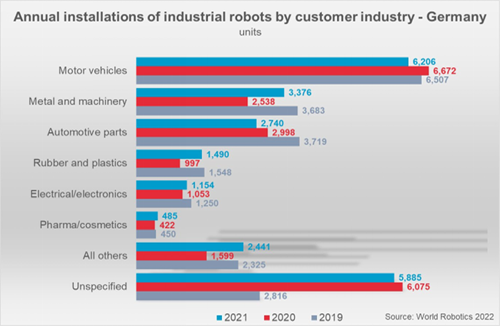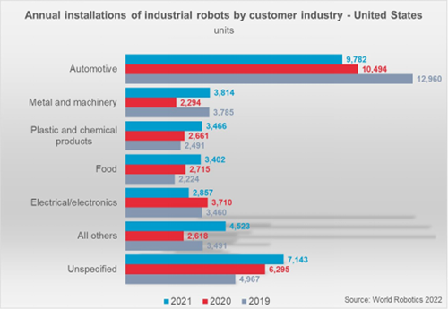 2021年,美國新裝機量為34,987臺,同比增長14%。略高于2019年新冠疫情前33378臺的水平,但仍大大低于2018年40373臺的歷史高點。汽車工業繼續保持美國第一大工業機器人應用領域,2021年新裝機9782臺,但同比下降了7%,汽車工業對機器人的需求已經連續5年下降。金屬和機械行業是美國工業機器人第二大應用行業,裝機量激增66%,達到3814臺。之后是塑料和化學制品行業,裝機3466臺,同比增長30%;食品和飲料行業裝機3402臺,同比增加25%,也達到了歷史峰值。此外,新冠疫情使醫療衛生領域對機器人的需求日益增長。
