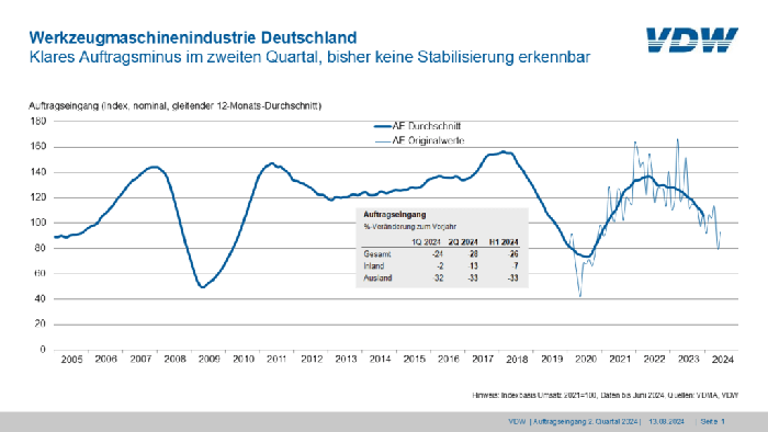 德國(guó)機(jī)床制造商協(xié)會(huì)(VDW)發(fā)布數(shù)據(jù)顯示,今年第二季度德國(guó)機(jī)床行業(yè)訂單同比下降28%,其中,國(guó)內(nèi)訂單下降13%,國(guó)外訂單下降33%。2024年上半年,訂單同比下降了26%,其中,國(guó)內(nèi)訂單下降7%,國(guó)外訂單下降33%。預(yù)計(jì)2024年的整體訂單量仍將大幅下降。VDW的預(yù)測(cè)合作伙伴Oxford Economics預(yù)計(jì),2025年和2026年所有地區(qū)的機(jī)床需求將出現(xiàn)明顯的廣泛復(fù)蘇。