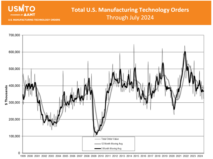 美國(guó)機(jī)械制造技術(shù)協(xié)會(huì)(AMT)發(fā)布數(shù)據(jù)顯示,7月制造技術(shù)訂單總額3.217億美元,環(huán)比下降19.3%,同比下降7.8%,1-7月訂單總額達(dá)到25.3億美元,同比下降10.5%。