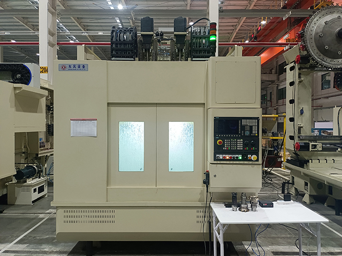該機(jī)是新能源壓鑄車身零件加工專機(jī),配置偏置式雙擺角萬能銑頭、自動翻轉(zhuǎn)液壓夾具、鼓式直排刀庫,一次裝夾,可實現(xiàn)壓鑄車身結(jié)構(gòu)件正反五面所有加工特征的高速、高精、高效自動加工。4臺CNC設(shè)備組線配置,與后續(xù)安裝拉鉚、壓鉚螺母、鋼絲螺套工位以及檢測工位等組成一體化車身鋁壓鑄零件加工機(jī)裝配生產(chǎn)線,滿足汽車主機(jī)廠產(chǎn)能和節(jié)拍需求。機(jī)床采用高剛度整體框架結(jié)構(gòu),移動部件采用超輕設(shè)計、各軸均采用電機(jī)直驅(qū)形式,配置鋁合金材質(zhì)偏置式BC擺頭,提高機(jī)床動態(tài)性能,直線軸快進(jìn)速度達(dá)到120m/min,加速度達(dá)到7m/s。研發(fā)自動翻轉(zhuǎn)工作臺,一次裝夾完成所有要素加工。同時根據(jù)零件數(shù)模,開展銑削特性研究與機(jī)床運(yùn)動仿真,優(yōu)化加工工藝路徑,形成總體工藝方案。該產(chǎn)品主要應(yīng)用在新能源汽車大型壓鑄車身零件的高速高效加工。