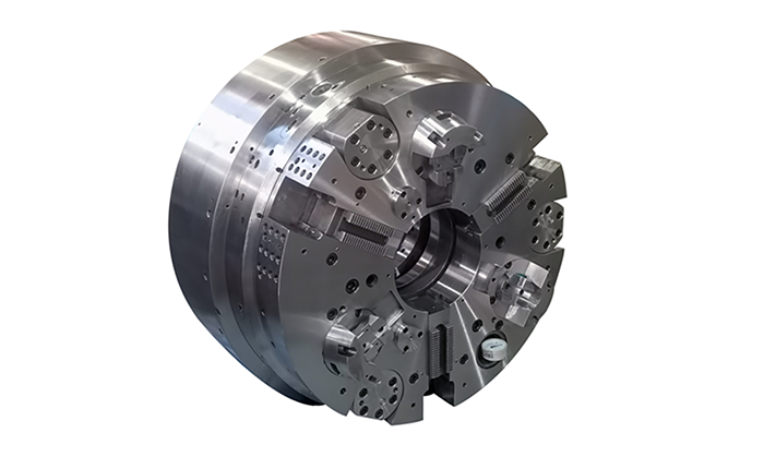 該卡盤是針對石油、天然氣管道加工行業(yè)所需的數(shù)控機(jī)床而研發(fā)的高端配套產(chǎn)品,具有全新性、高效性、安全性特點。卡盤采用四套機(jī)構(gòu),分別實現(xiàn)長徑比大的鋼管自定心夾緊、浮動夾緊、夾緊力損失補(bǔ)償和快進(jìn)慢夾功能。先對工件前端進(jìn)行自定心夾緊,然后進(jìn)行浮動夾緊,減少工件的撓曲和變形,確保工件在加工過程中的穩(wěn)定性和精確性。同時,通過與楔心套連接的滑座,經(jīng)由不同的斜面完成卡盤的快進(jìn)慢夾動作,實現(xiàn)卡盤的浮動夾緊功能。卡盤的夾緊力輔助補(bǔ)償功能由內(nèi)部的蓄能裝置及滑座與盤體之間配置的配重塊來完成。另外,卡盤可與數(shù)控機(jī)床系統(tǒng)對接進(jìn)行自動控制,實現(xiàn)遠(yuǎn)程監(jiān)控和自動化生產(chǎn),降低人工勞動強(qiáng)度,提高工作安全性和生產(chǎn)效率。