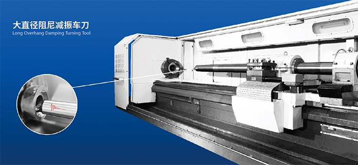 該刀具技術優勢:刀桿直徑可達Φ300,刀具長徑比可達16倍,刀具懸深長度可達4m,刀具內部具有獨特的內置阻尼減振系統,可有效抑制切削加工中的振動。并采用了快換式刀頭PSC 接口設計,解決了不同內腔形狀需要不同刀頭加工的問題,以及大直徑阻尼減振車刀更換困難的問題。刀具通過整體結構優化設計,并優化配置合金鋼與硬質合金等多種材料,既提高刀具剛性,又具備足夠的強度與韌性,達到重型深孔加工阻尼減振刀具懸伸16倍徑時能穩定切削的目標。通過快換式刀頭結構設計提高使用便攜性,通過串聯式內冷結構設計提高冷卻系統性能,保證刀尖的耐用度。