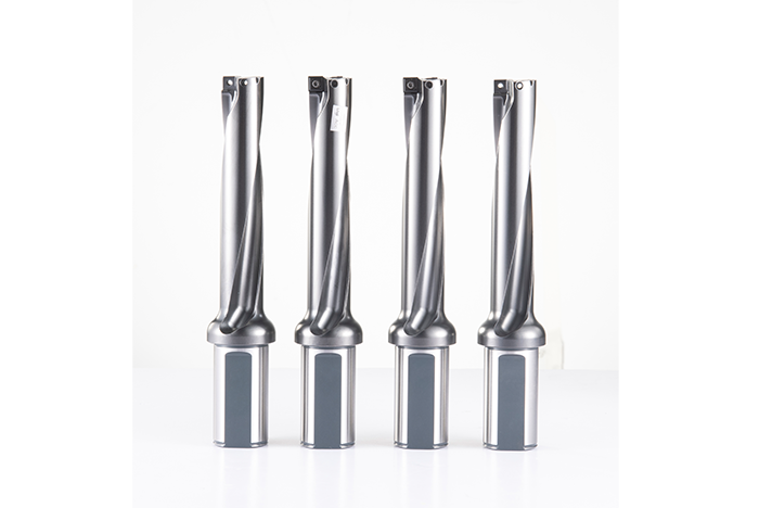 該淺孔鉆的鉆桿上設有兩條螺旋狀的排屑槽,鉆桿前端設有不同朝向的外刃刀片槽和內刃刀片槽,外刃刀片槽和內刃刀片槽的安裝內側面分別設有刀片安裝孔,鉆桿和連接柄上設有兩條貫穿的內冷卻孔,內冷卻孔的出水口分別位于鉆桿的端面和端部側面。采用“U鉆鉆體雙螺旋扭制工藝”,通過熱扭擰工藝實現雙螺旋內冷孔設計,芯厚為刃徑的20%,大螺旋角和加深螺旋槽設計大幅提升了排屑性能。雙內冷孔的設計增加了冷卻液流量,有利于刀片降溫以延長壽命。鉆桿基體通過真空熱處理,大幅增加鉆體的剛性,保證了產品加工過程中的精度和穩定性,尤其適用于小孔徑快速淺孔鉆。