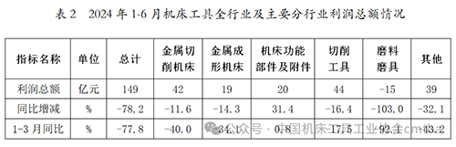 2024年1-6月,機床工具全行業(yè)實現(xiàn)利潤總額149億元,同比下降78.2%,降幅較1-3月擴大0.4個百分點。其中,金屬切削機床同比下降11.6%,降幅較1-3月收窄28.4個百分點;金屬成形機床同比下降14.3%,降幅較1-3月收窄19.8個百分點。