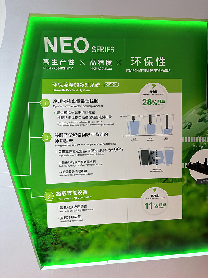 綠色技術(shù)方面,很多國外機(jī)床廠商展示了其系統(tǒng)性的研究應(yīng)用。如日本大隈采取削減機(jī)床運(yùn)轉(zhuǎn)時的能源消耗、關(guān)閉不使用的設(shè)備、縮短加工時間、分析優(yōu)化減排點(diǎn)等措施來實(shí)現(xiàn)減排目的;德馬吉森精機(jī)的機(jī)床產(chǎn)品實(shí)現(xiàn)100%碳中和,從原料采購到產(chǎn)品交付全過程綠色化;山崎馬扎克展示了NEO系列產(chǎn)品,搭載節(jié)能設(shè)備,可通過模擬計(jì)算實(shí)現(xiàn)冷卻液排出量的最佳控制。