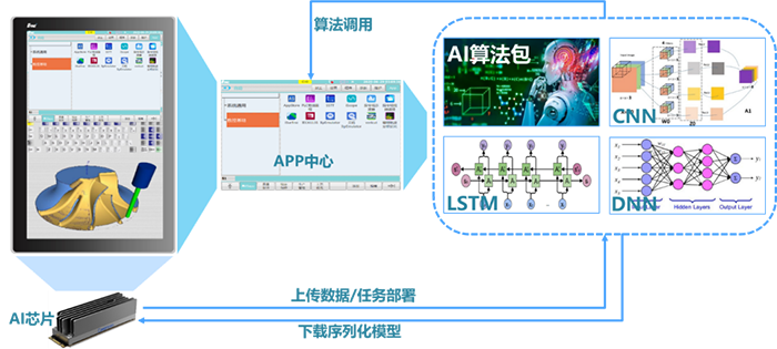 華中9型智能數(shù)控系統(tǒng)踐行“智能+”為機(jī)床賦能的創(chuàng)新理念,構(gòu)筑人(H)-機(jī)(P)-信息(C)融合的數(shù)字孿生系統(tǒng)(S)(HCPS)。該系統(tǒng)深度融合大數(shù)據(jù)與人工智能技術(shù),打造了“端-邊-云”的智能體系架構(gòu),形成了集成AI芯片的智能硬件平臺(tái)、支持AI算法的智能軟件平臺(tái)、構(gòu)建智能APP生態(tài)的開放平臺(tái)。