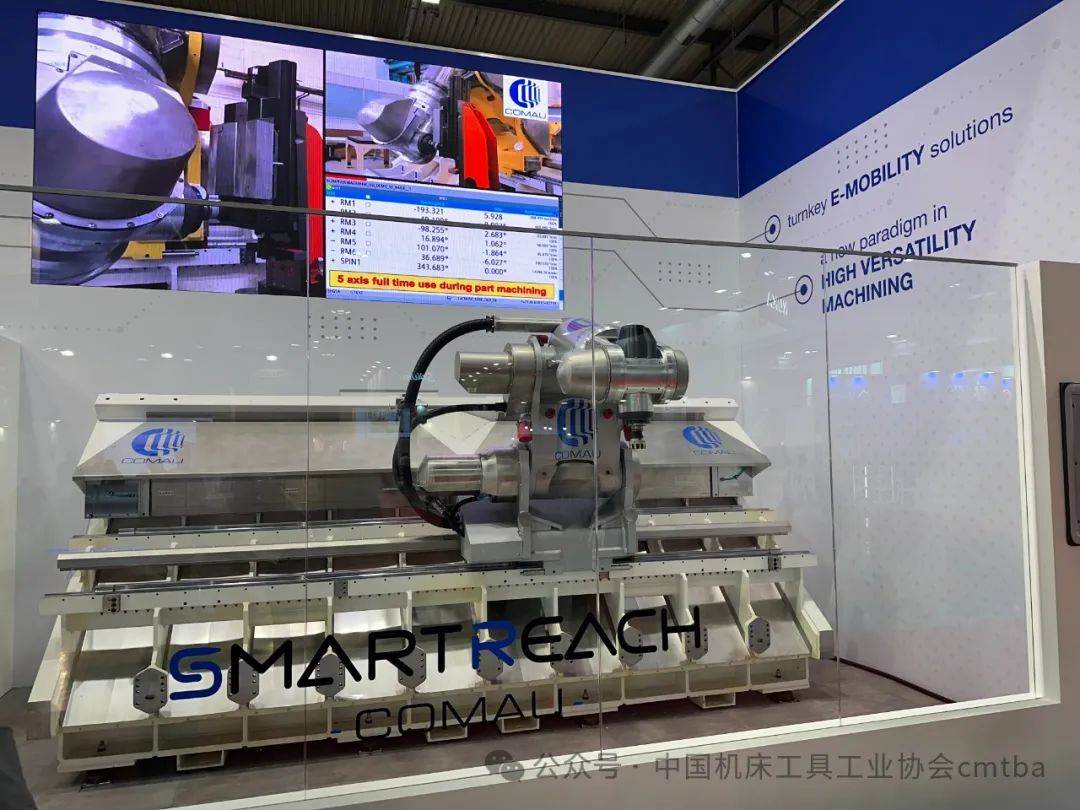 意大利COMAU公司在本屆展會(huì)推出全球首發(fā)Smart-Reach高速加工中心,機(jī)床采用一個(gè)直線軸和多個(gè)關(guān)節(jié)機(jī)械手的旋轉(zhuǎn)軸,以半圓柱形包絡(luò)面圍繞工件移動(dòng),具有五軸聯(lián)動(dòng)加工功能,工件一次裝夾可實(shí)現(xiàn)六面加工。機(jī)床重復(fù)定位精度±0.003mm,X/Y/Z軸的快移速度為80/90/90m/min,加速度0.8g。適用于大型輕量化結(jié)構(gòu)件的高效靈活加工,如大型鑄件底座、電池托盤、航空結(jié)構(gòu)件等。