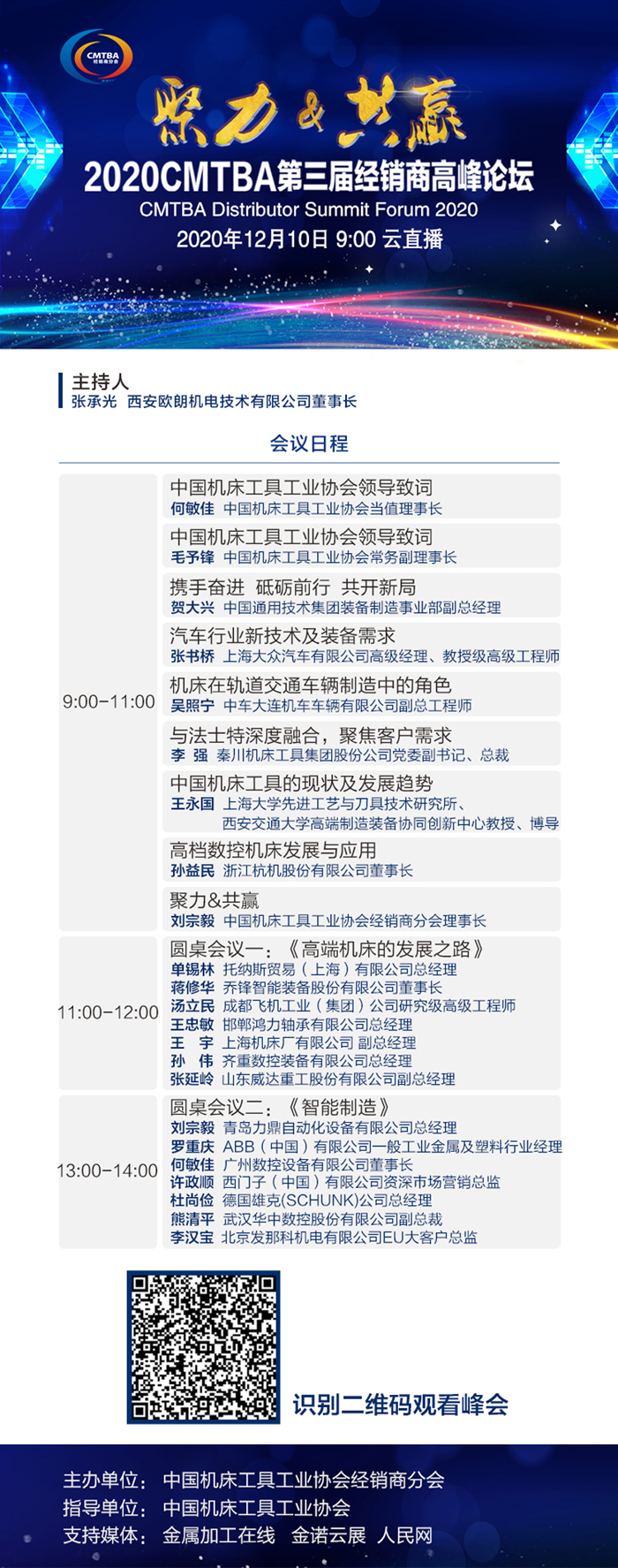由中國機床工具工業(yè)協(xié)會經銷商分會組織的“2020CMTBA第三屆經銷商高峰論壇”于今天(12月10日,星期四)上午9點準時開播。考慮到疫情原因,本屆峰會不進行大規(guī)模聚集召開,除在青島召開主論壇外,組織了分設在沈陽、泊頭、常州、西安、成都、青島的6個線下分會場,由所在片區(qū)的經銷商副理事長牽頭,與經銷商、專家、客戶、制造商們進行面對面的深度交流。